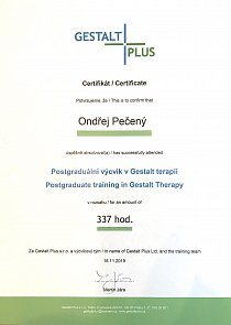 / Certifikát o absolvování tříletého postgraduálního výcviku v gestalt terapii v Gestalt plus s.r.o.